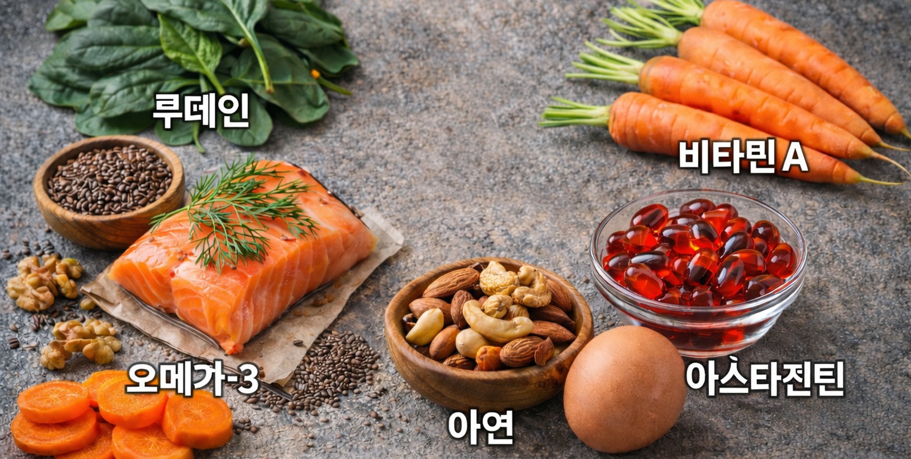 루테인, 오메가3, 아연, 아스타잔틴, 비타민A는 눈 건강을 유지하고 노안 증상을 늦추는 데 과학적으로 입증된 핵심 성분입니다.